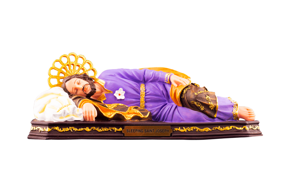 Detailed Design: Saint Joseph is shown sleeping peacefully on a white pillow, with a golden halo, symbolizing his divine role as protector.