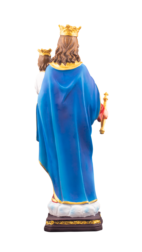 Detailed Design: Mary holds the Child Jesus with loving care; both are crowned in gold. Mary’s scepter represents her power and guidance, while the Child Jesus extends His hand in blessing.