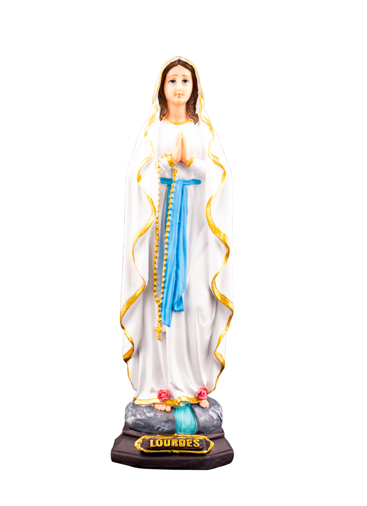 Decorative Base: Mounted on a sturdy base inscribed with “Lourdes,” adding elegance and devotional significance.