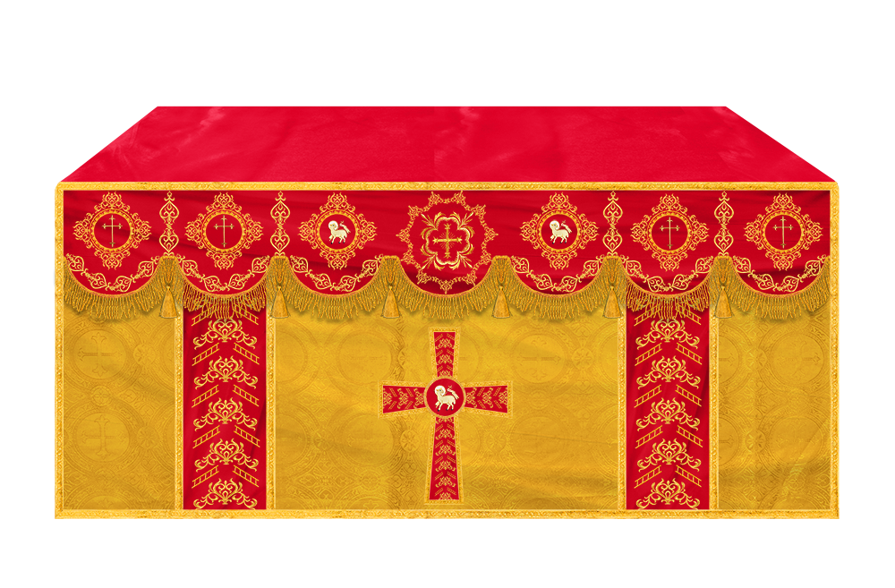 The altar frontal is made of fine fabric with embroidered Spiritual Motif