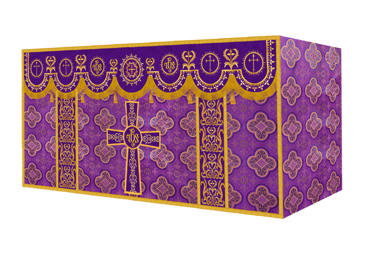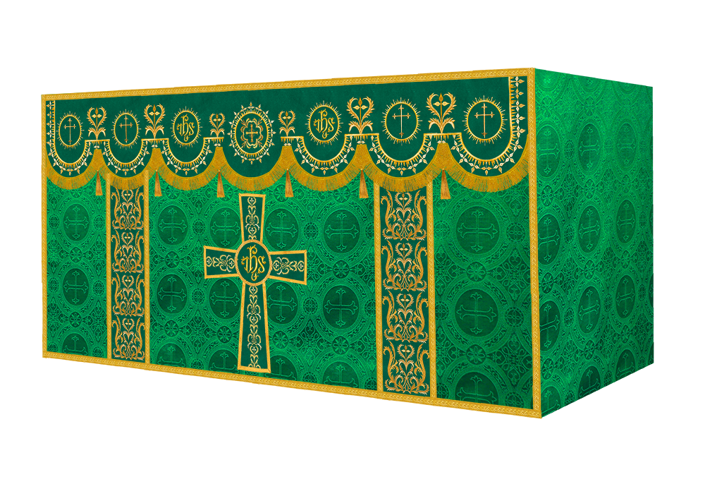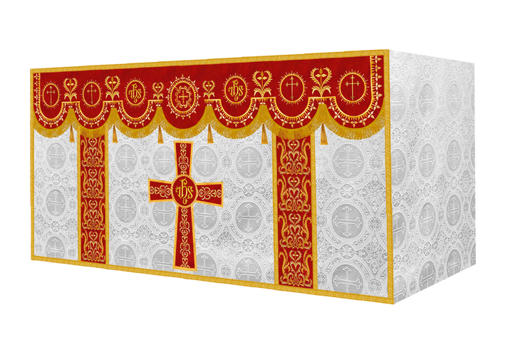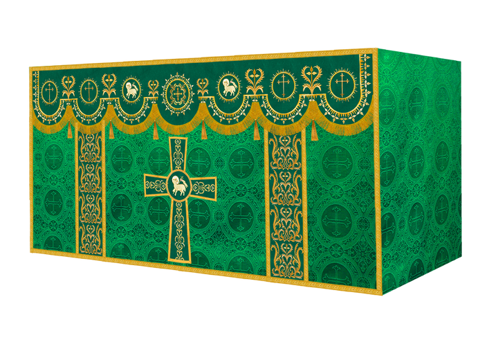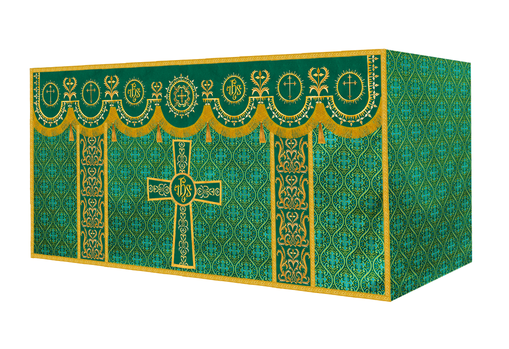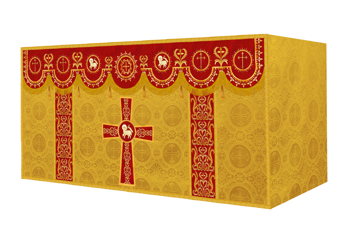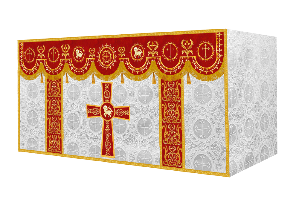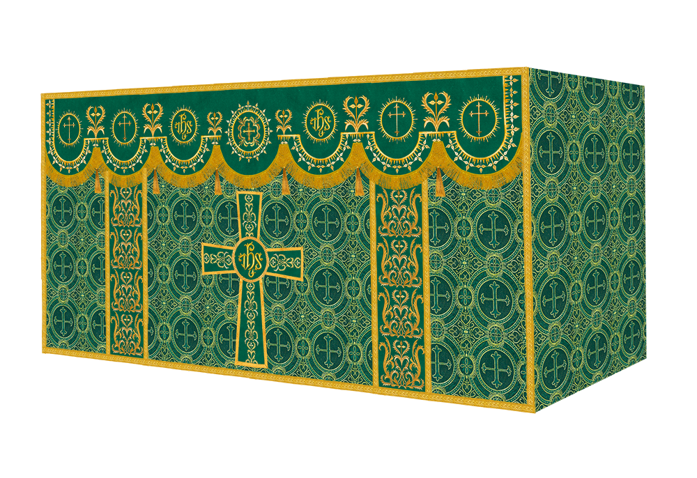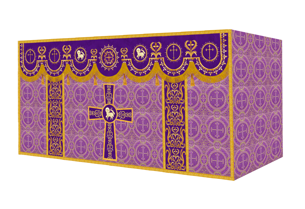 The altar frontal is made of fine fabric with embroidered Spiritual Motif