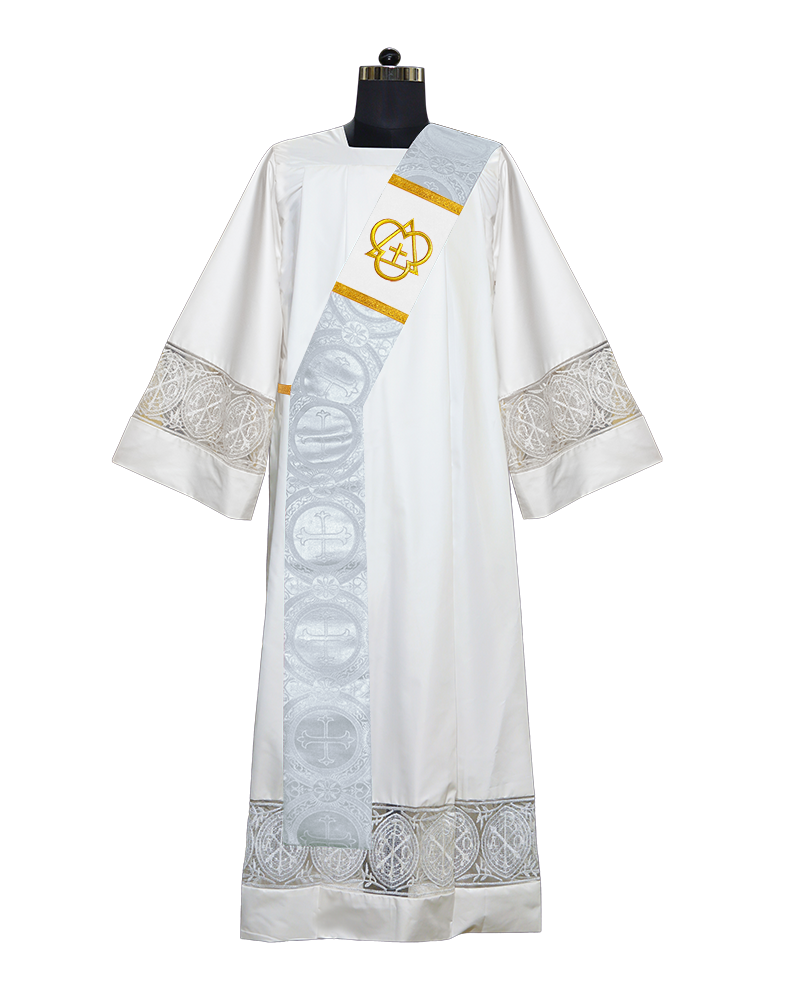 A Deacon can also wear a stole, but it is customary for a deacon to wear it over the left shoulder, tied at the waist on the right side so that the stole hangs diagonally across the chest. A stole can be worn over a robe, an Alb, or a Cassock.