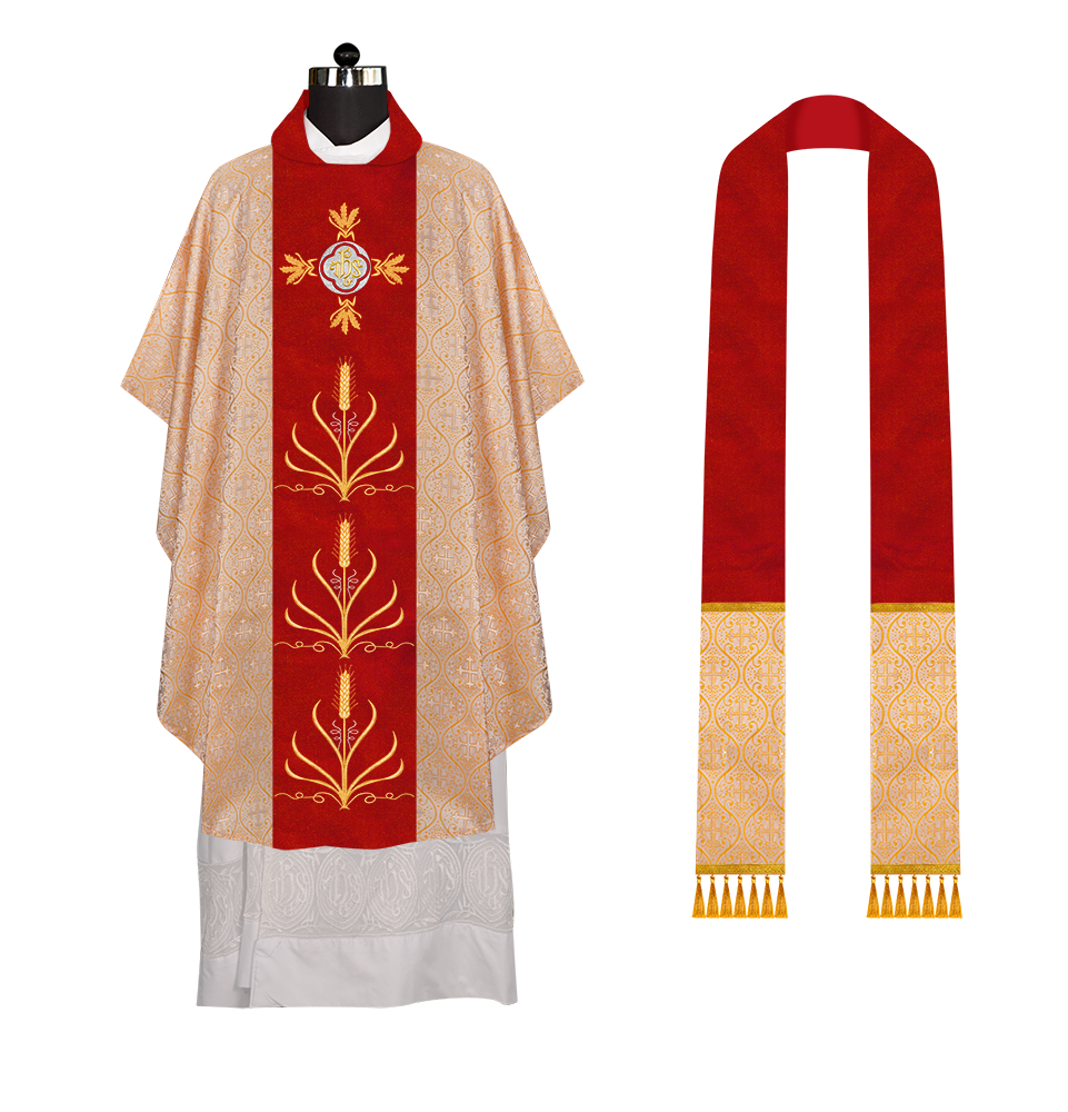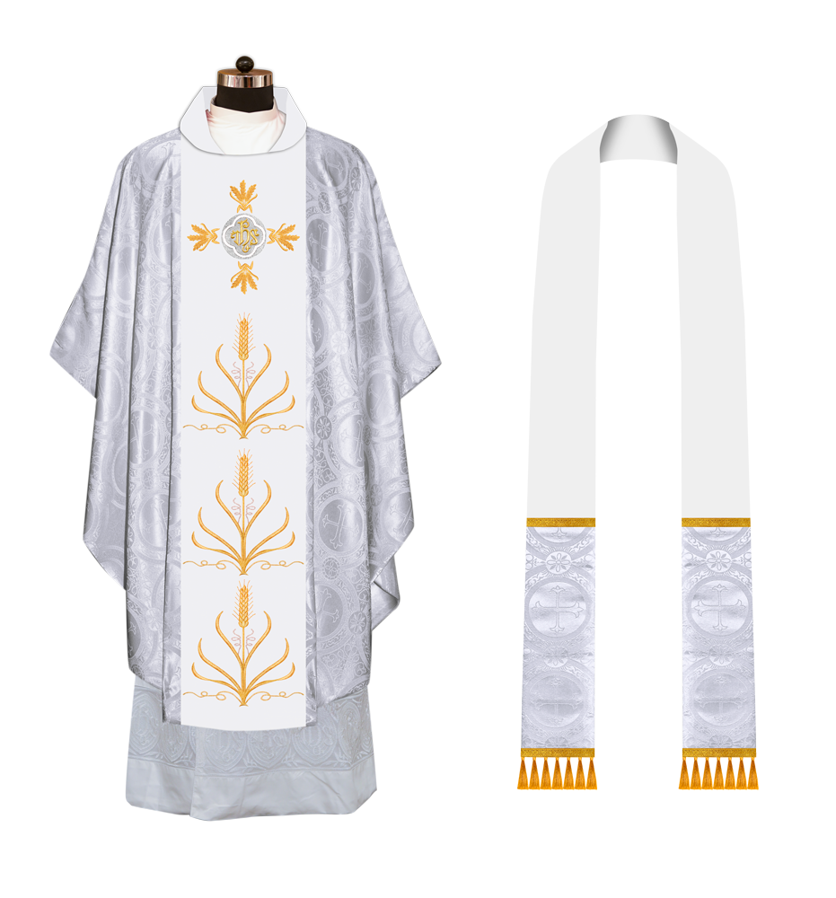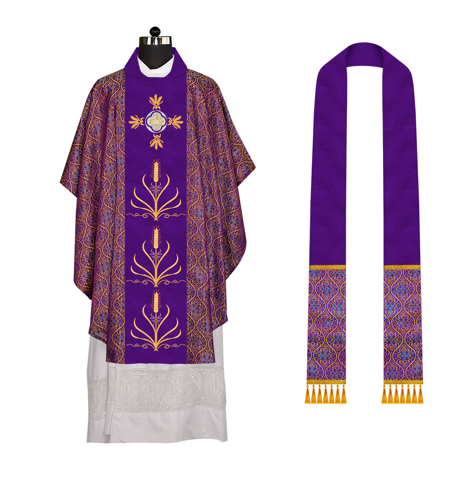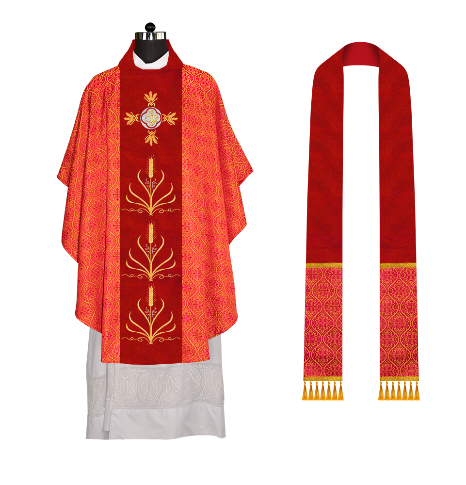 * Polyester Blend Viscose fabric * Damask * Brocade * Ogee ● A matching stole is included in the set (50'' Long, 6'' Wide) Optional: ● The collar type of the chasuble can be made from any of the following collar options with no additional charges * Cowl * Pullover * Standup * Zipper