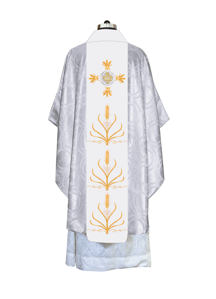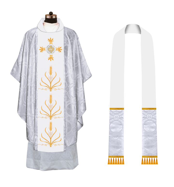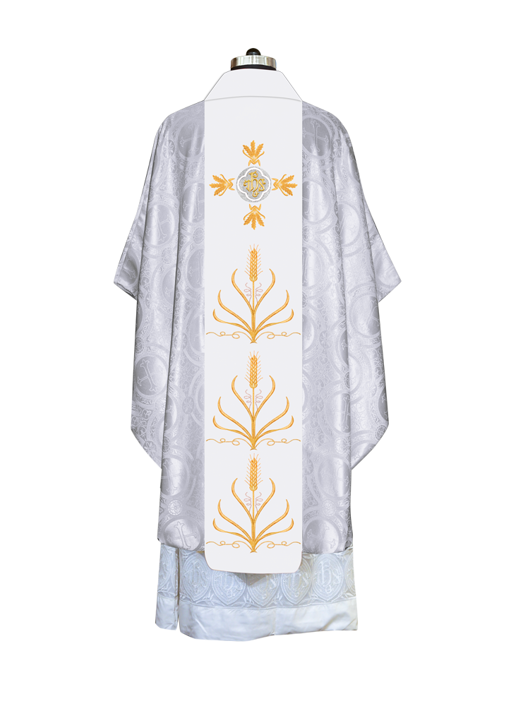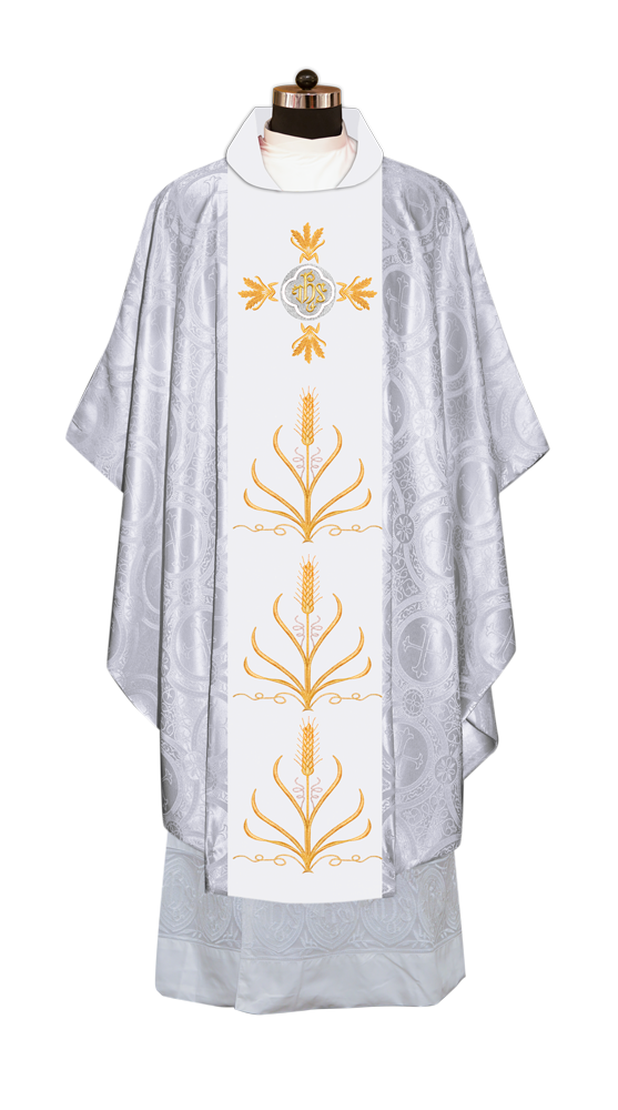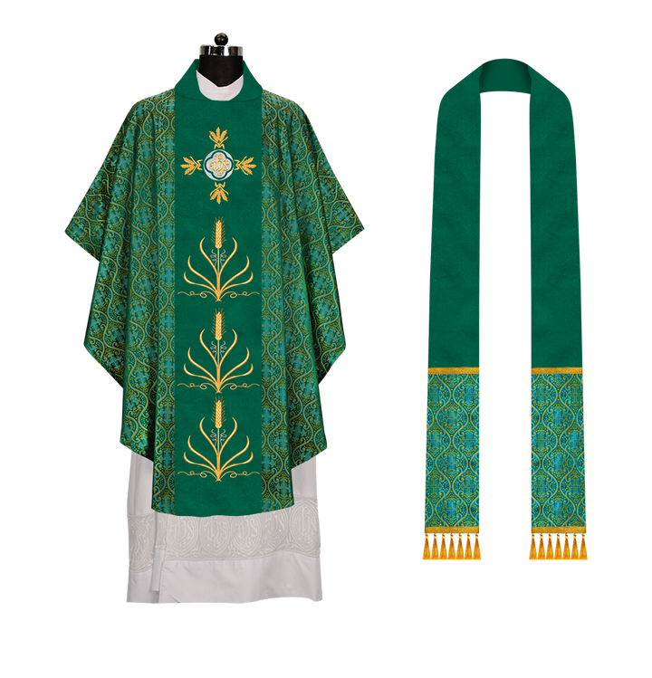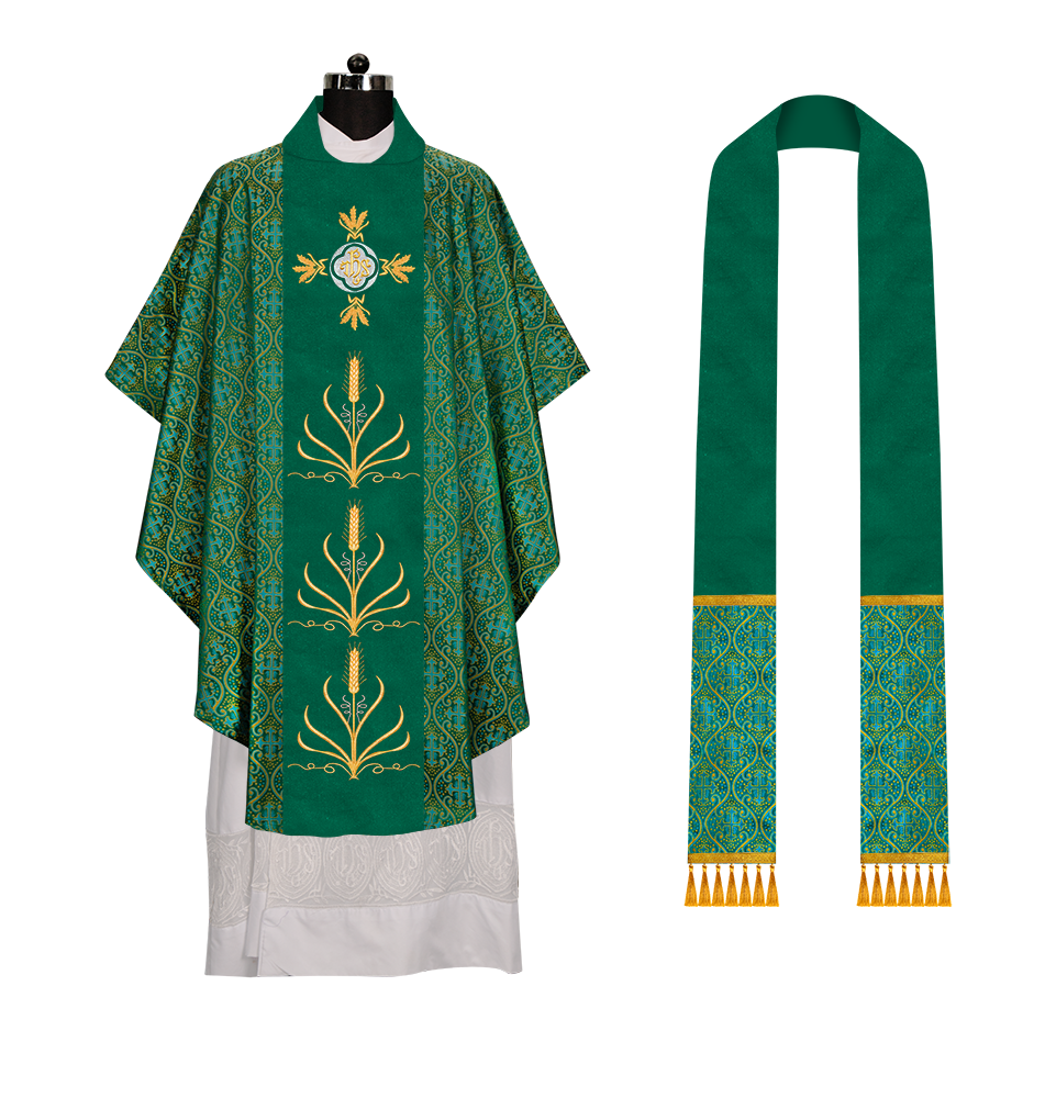* Polyester Blend Viscose fabric * Damask * Brocade * Ogee ● A matching stole is included in the set (50'' Long, 6'' Wide) Optional: ● The collar type of the chasuble can be made from any of the following collar options with no additional charges * Cowl * Pullover * Standup * Zipper