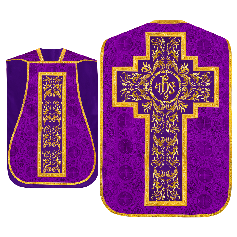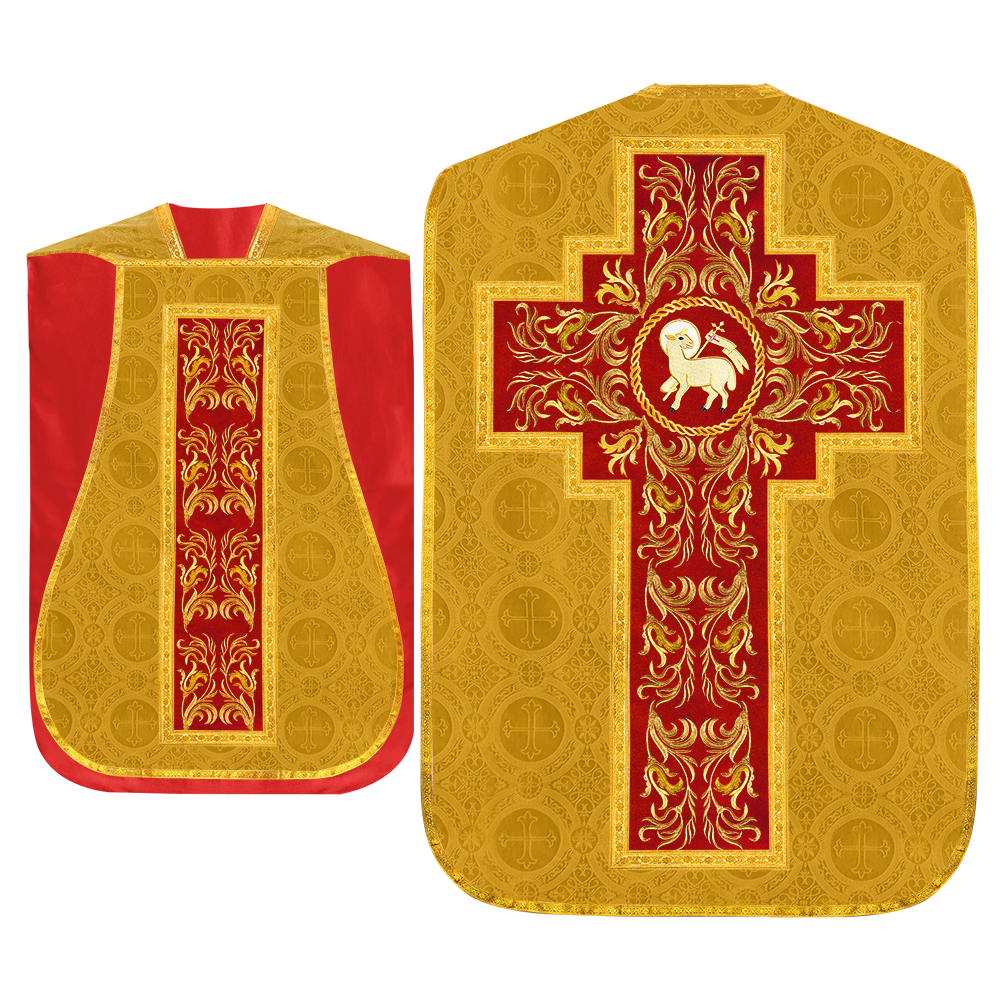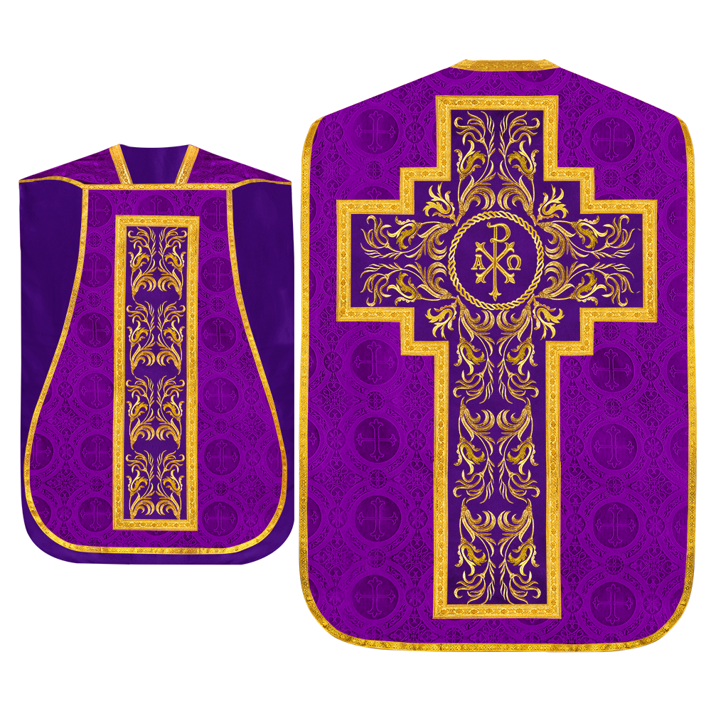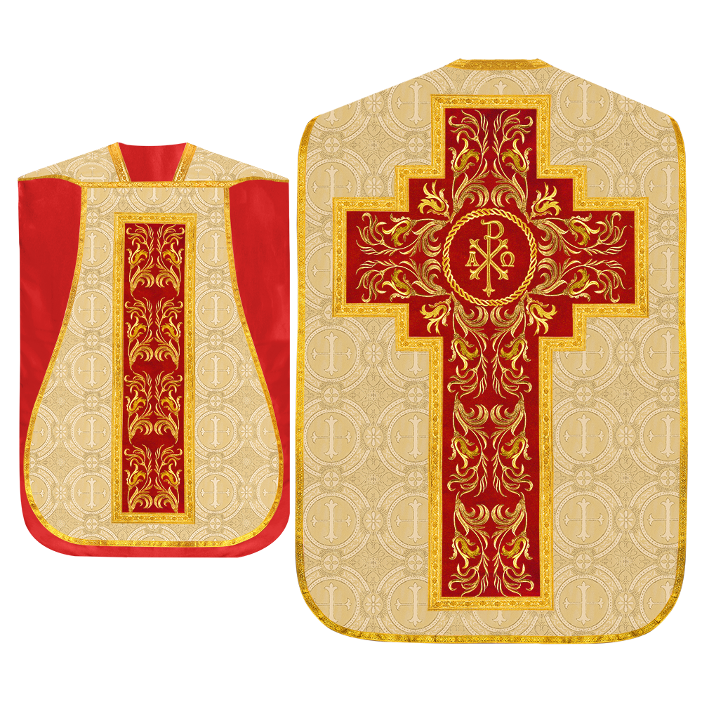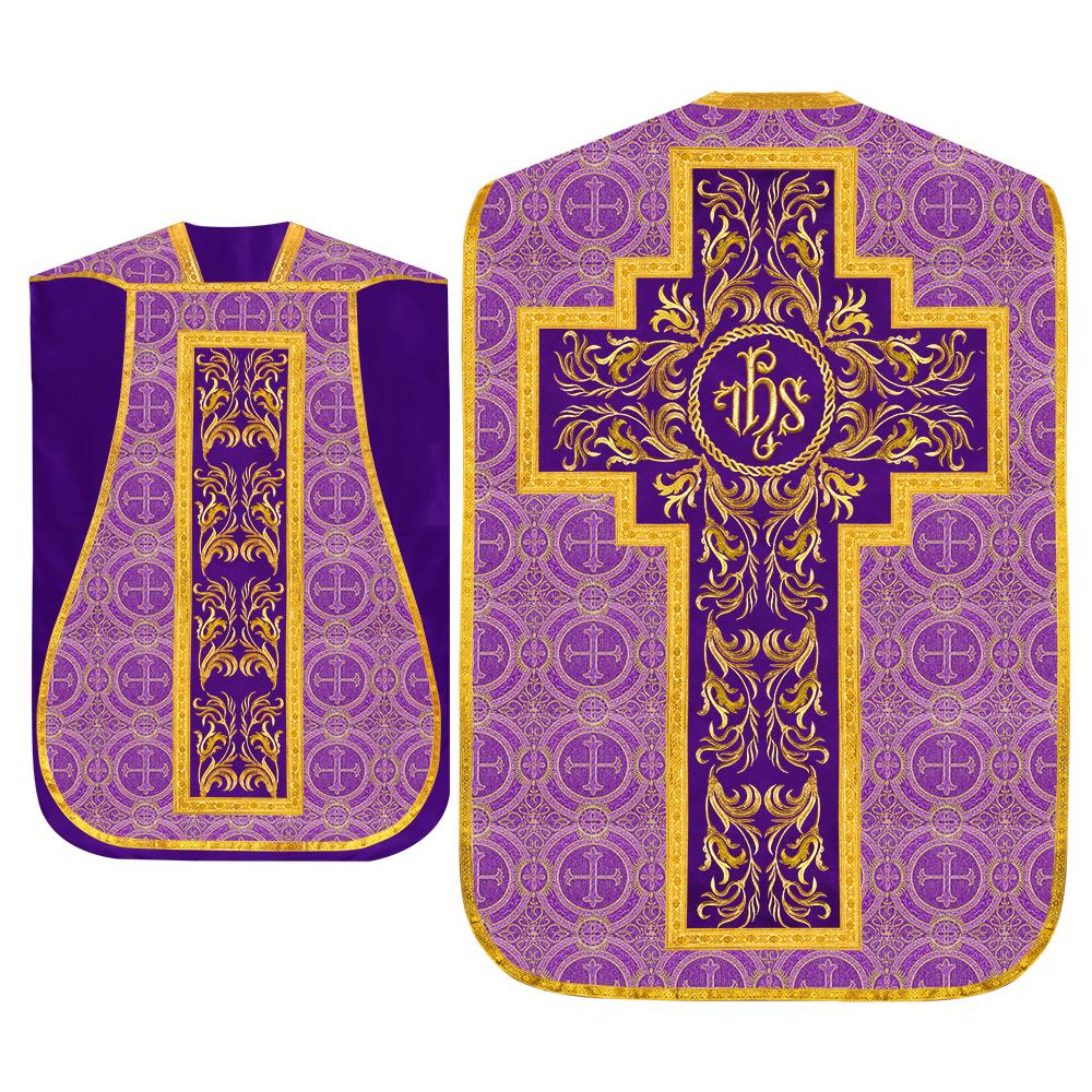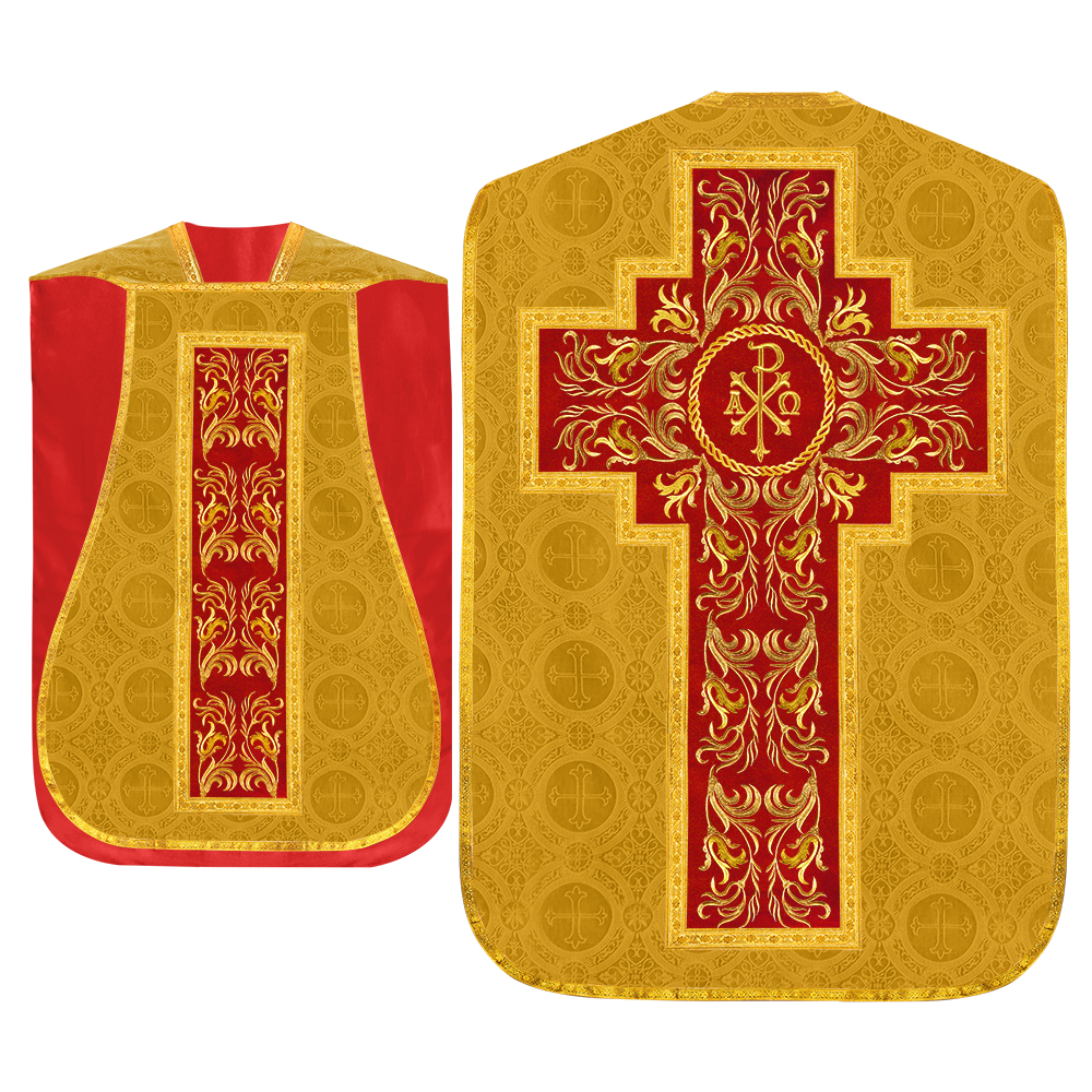 This set comprises beautiful fiddleback with matching stole The Fiddleback is made of Damask Fabric. It has satin fabric lining. The attractive Orphrey is made of matching silk fabric. The Orphrey is embroidered with rich golden yarns. The ends of the whole vestment are finished with golden braids. Mass set is optional with extra charges.
