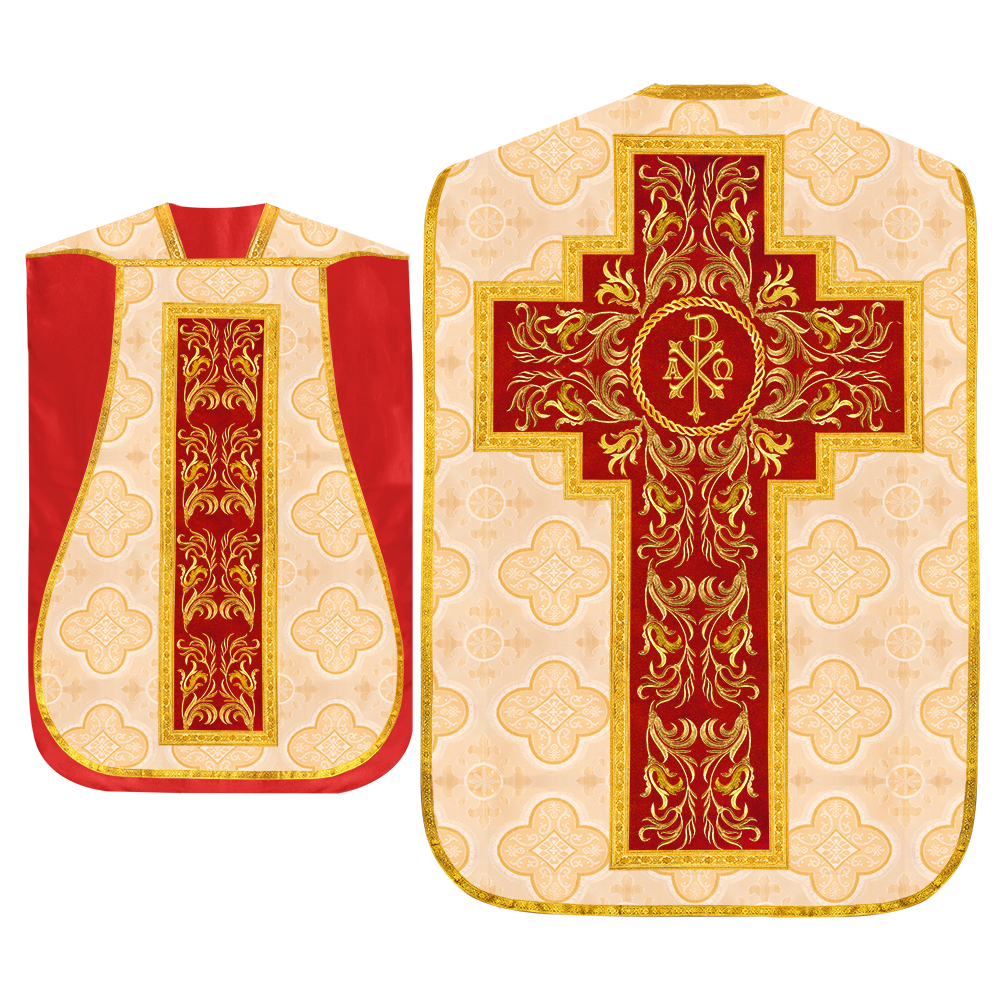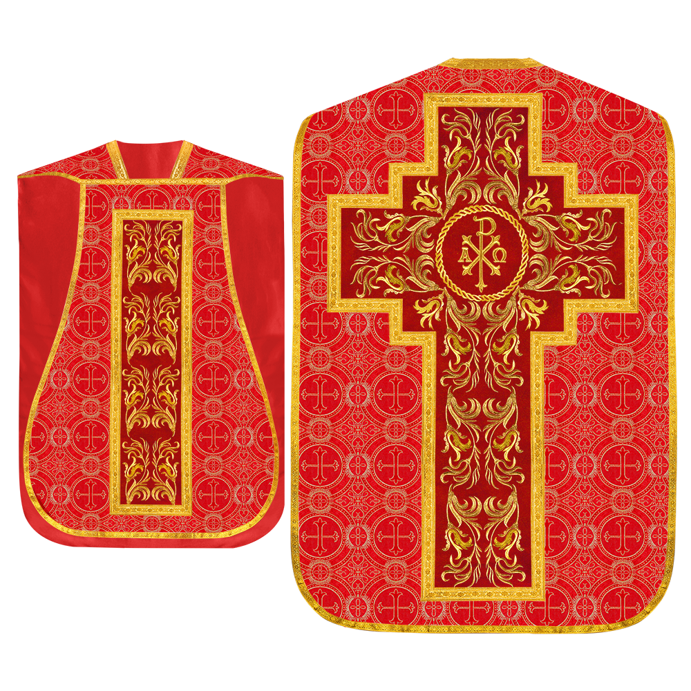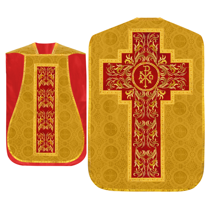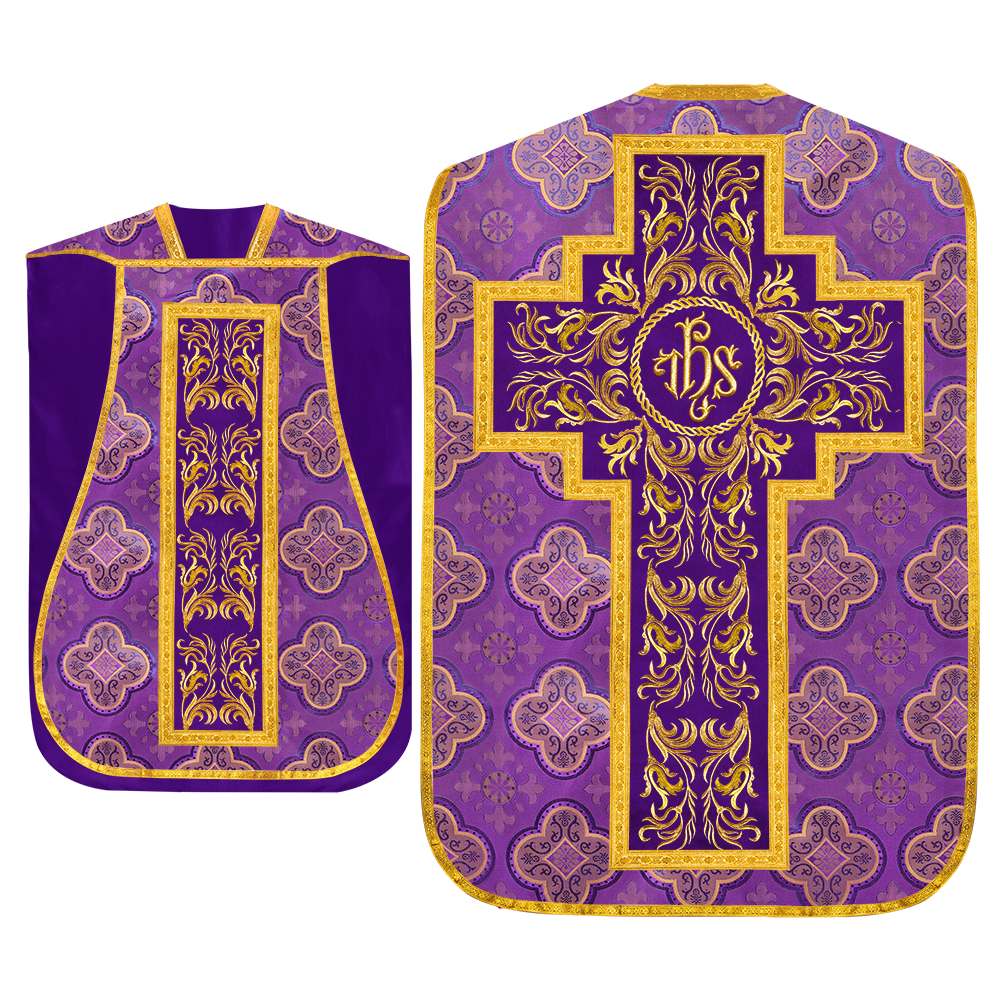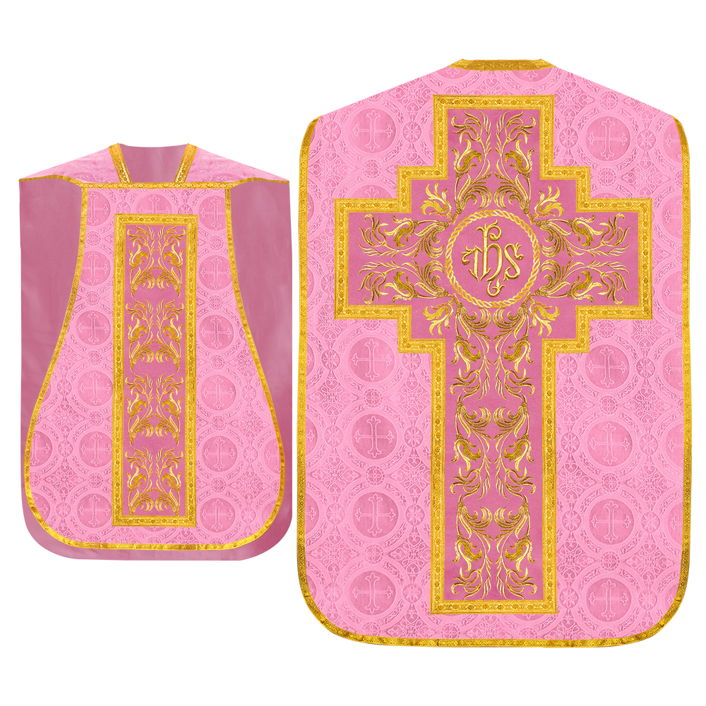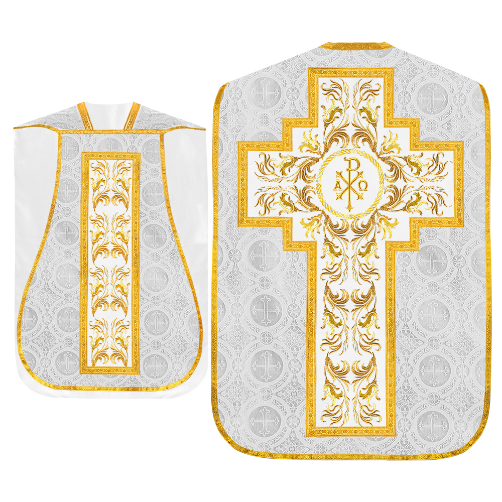 This set comprises beautiful fiddleback with matching stole The Fiddleback is made of Damask Fabric. It has satin fabric lining. The attractive Orphrey is made of matching silk fabric. The Orphrey is embroidered with rich golden yarns. The ends of the whole vestment are finished with golden braids. Mass set is optional with extra charges.