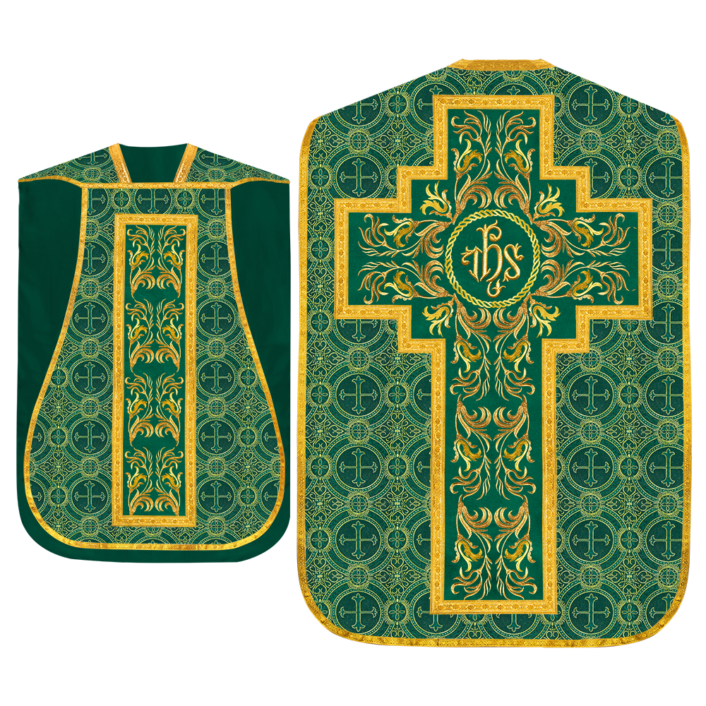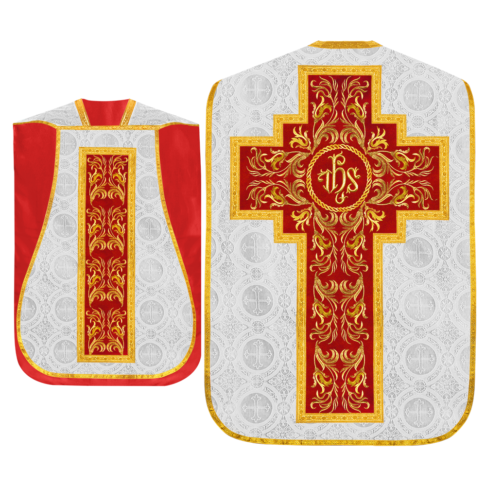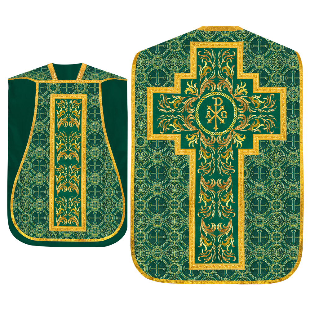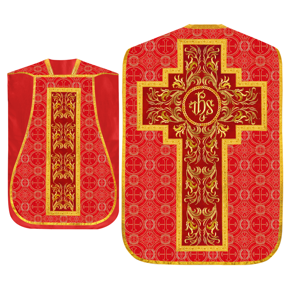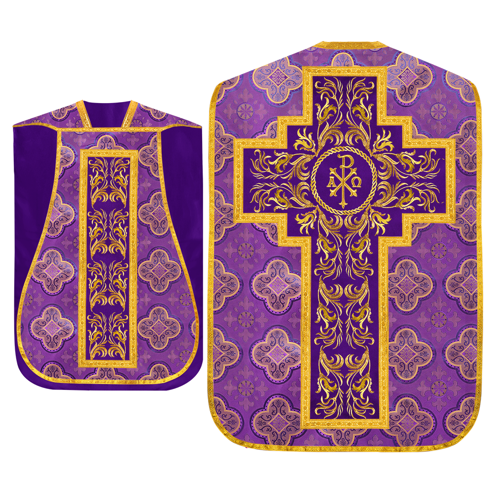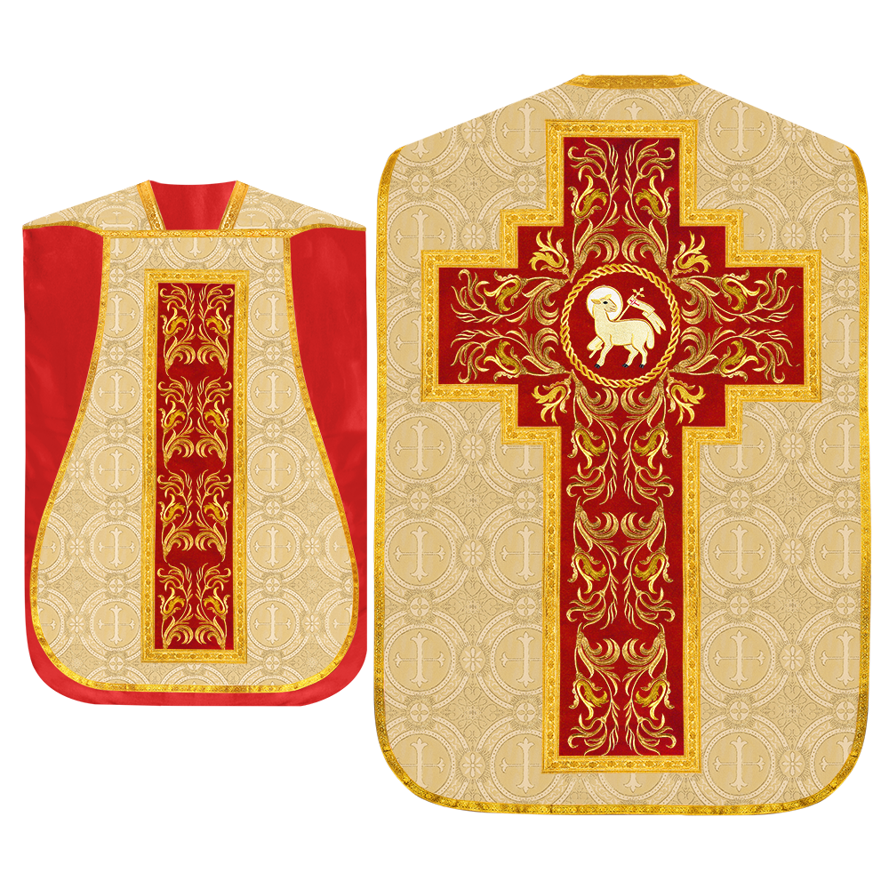This set comprises beautiful fiddleback with matching stole The Fiddleback is made of Damask Fabric. It has satin fabric lining. The attractive Orphrey is made of matching silk fabric. The Orphrey is embroidered with rich golden yarns. The ends of the whole vestment are finished with golden braids. Mass set is optional with extra charges.