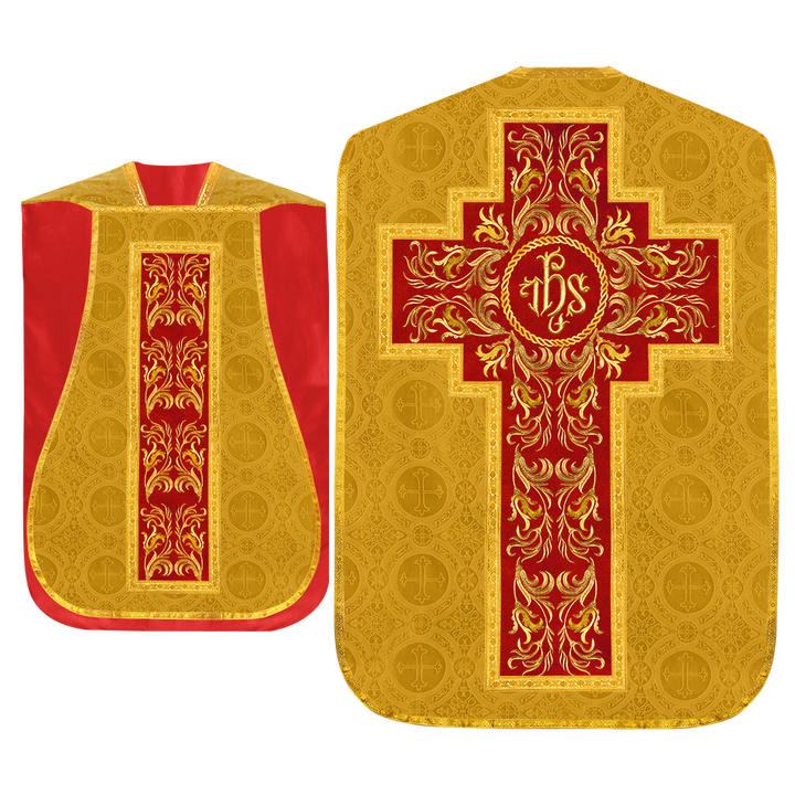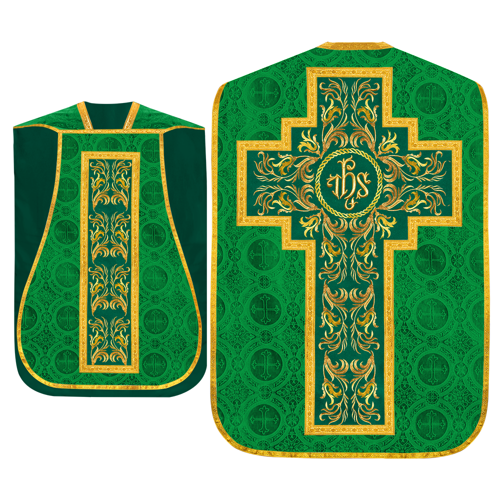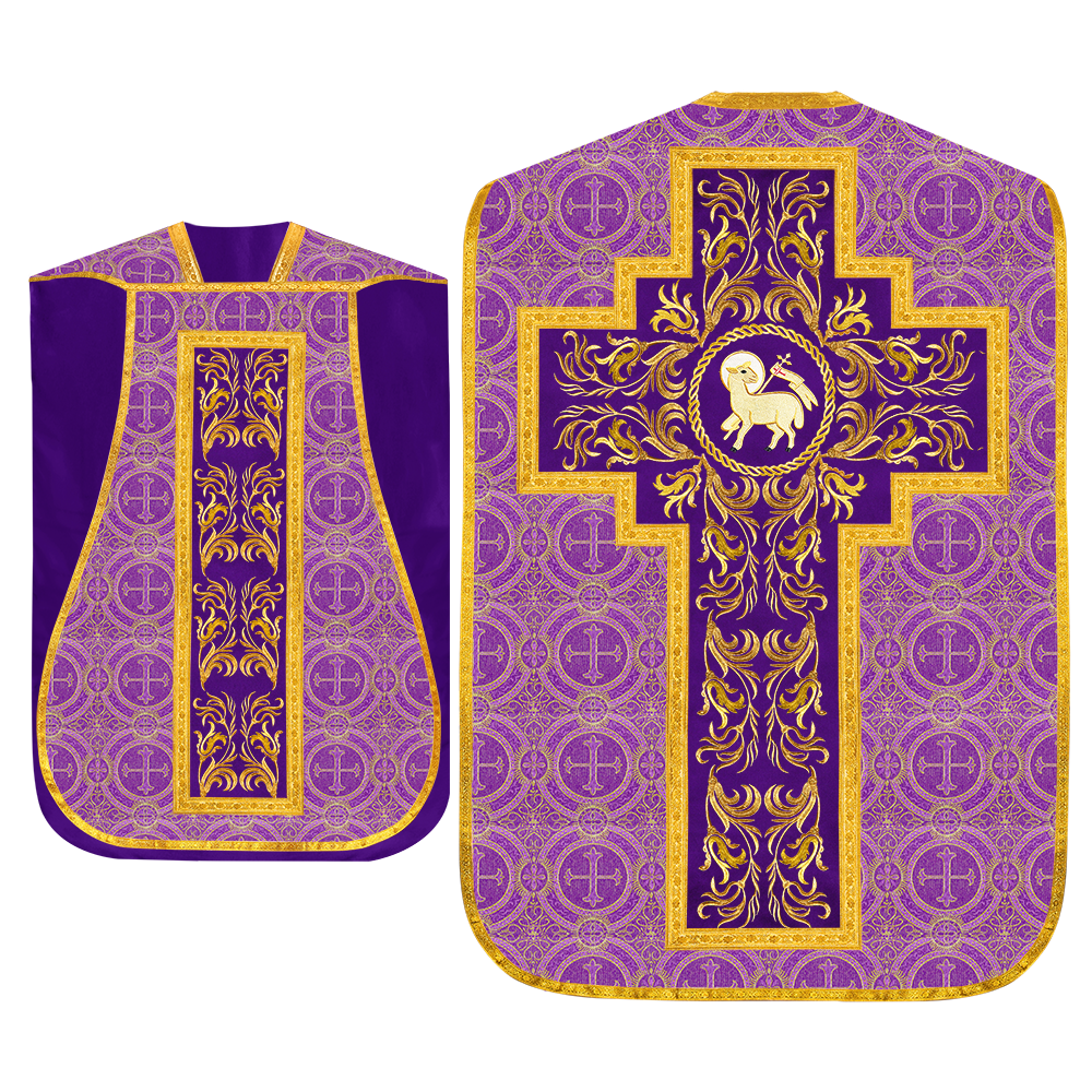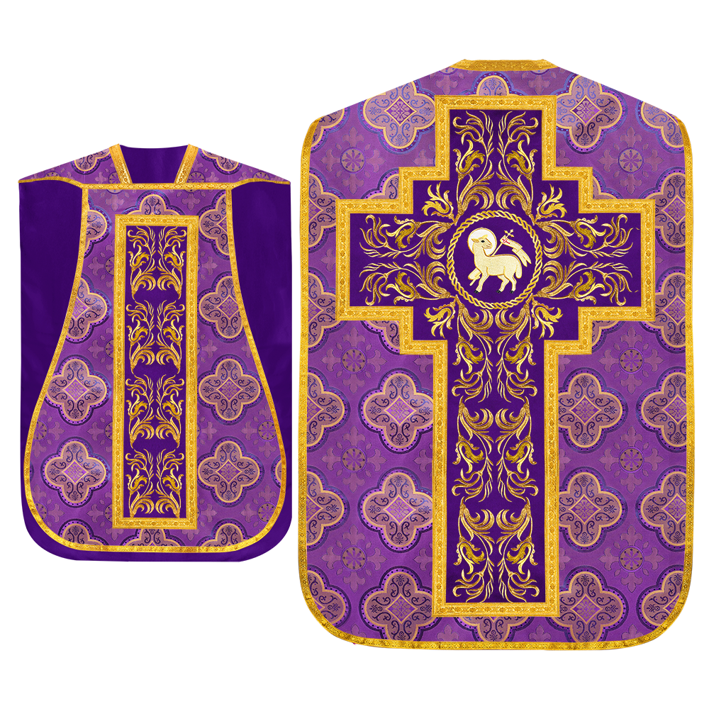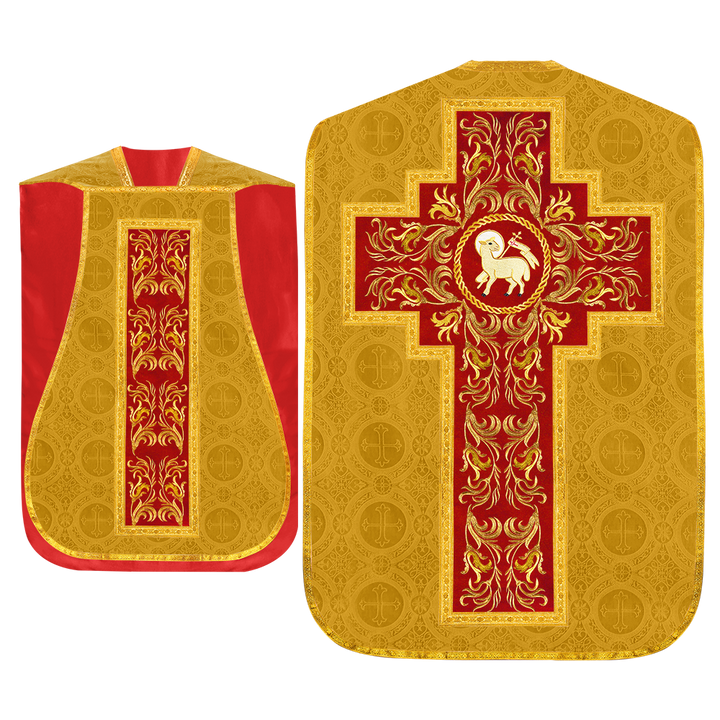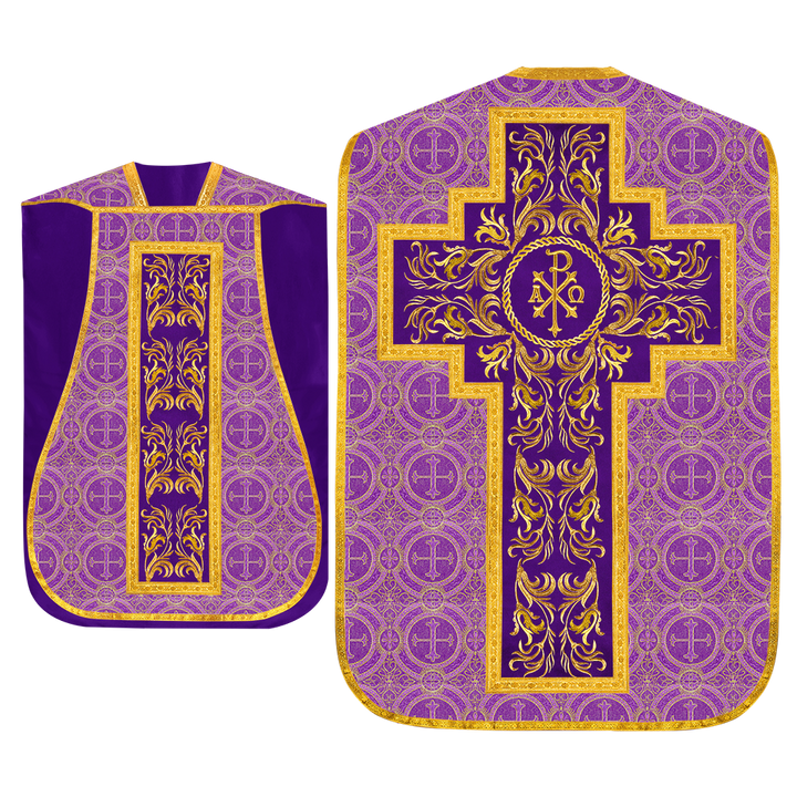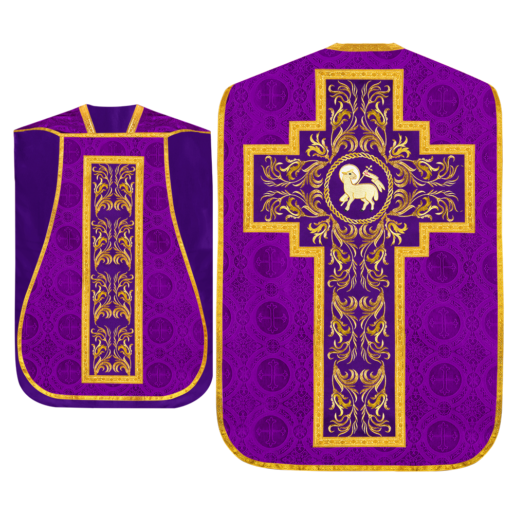 This set comprises beautiful fiddleback with matching stole The Fiddleback is made of Damask Fabric. It has satin fabric lining. The attractive Orphrey is made of matching silk fabric. The Orphrey is embroidered with rich golden yarns. The ends of the whole vestment are finished with golden braids. Mass set is optional with extra charges.