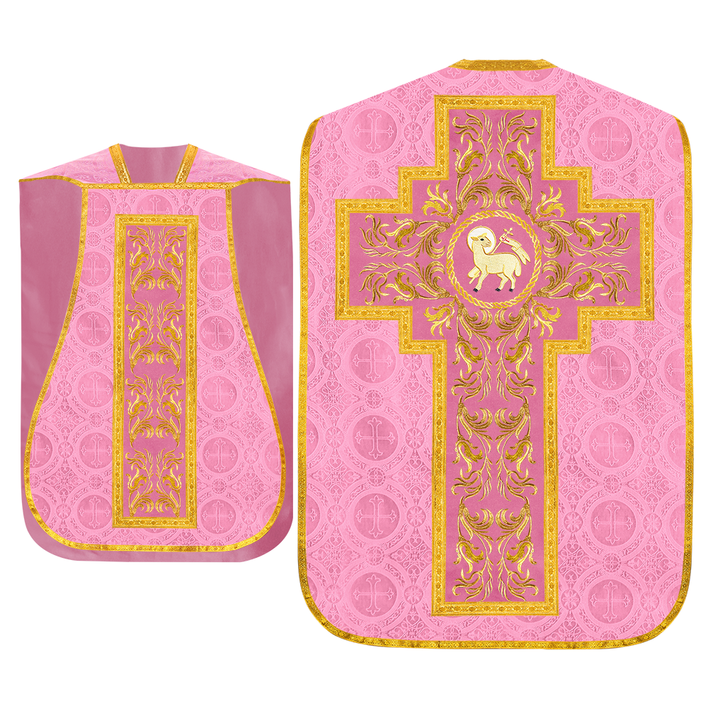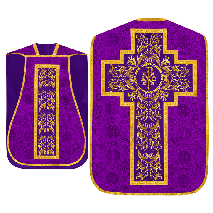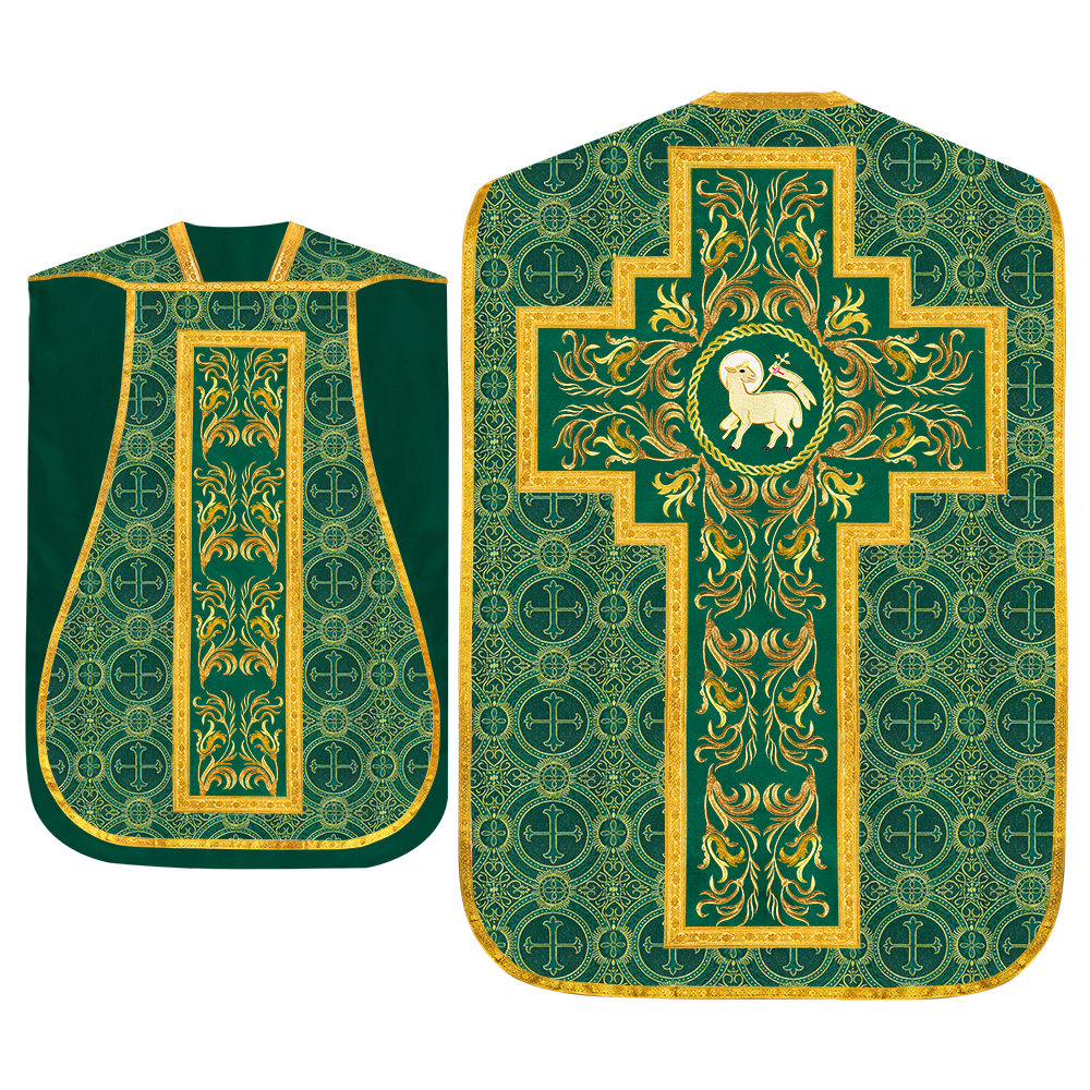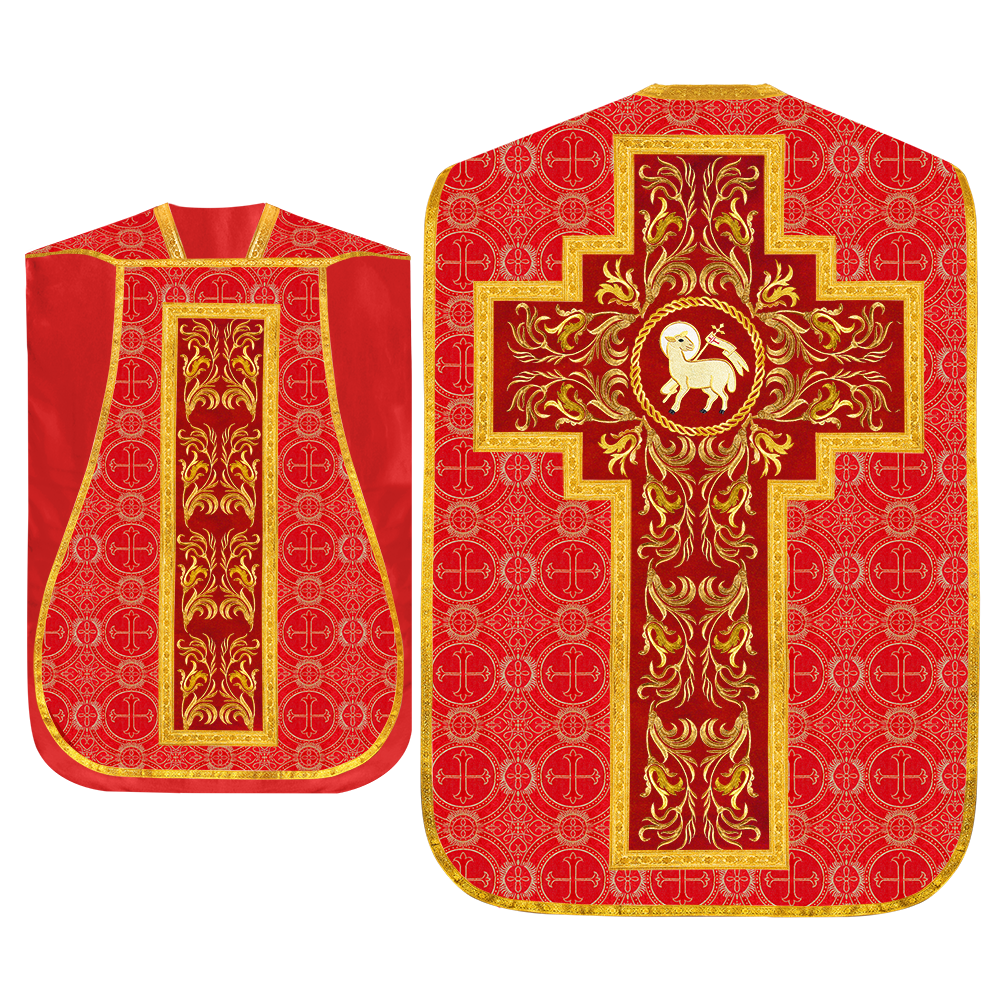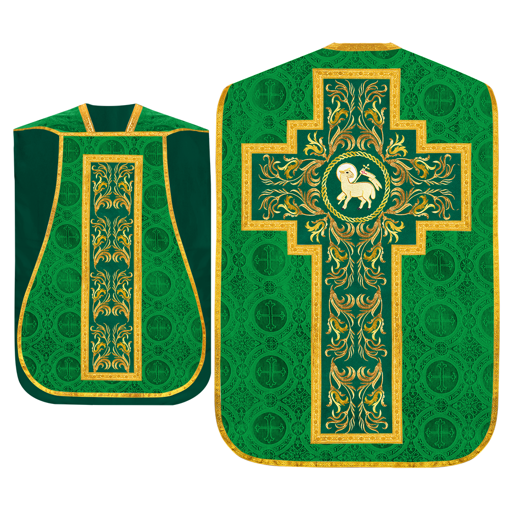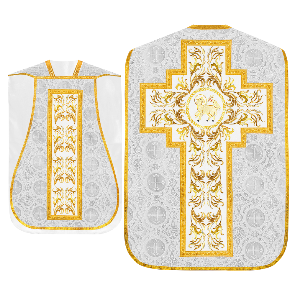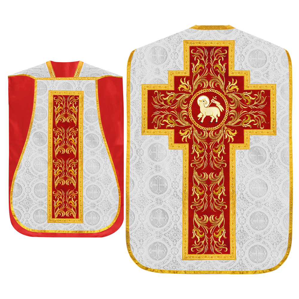 This set comprises beautiful fiddleback with matching stole The Fiddleback is made of Damask Fabric. It has satin fabric lining. The attractive Orphrey is made of matching silk fabric. The Orphrey is embroidered with rich golden yarns. The ends of the whole vestment are finished with golden braids. Mass set is optional with extra charges.