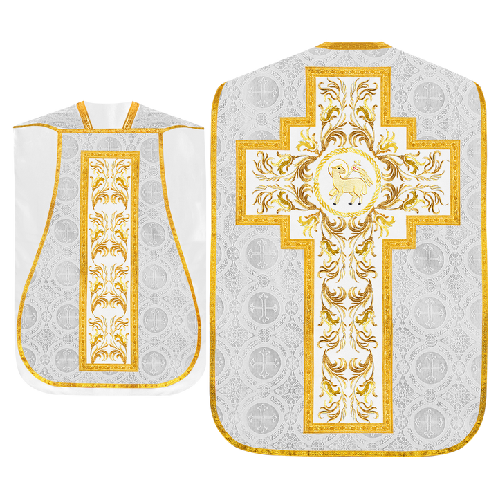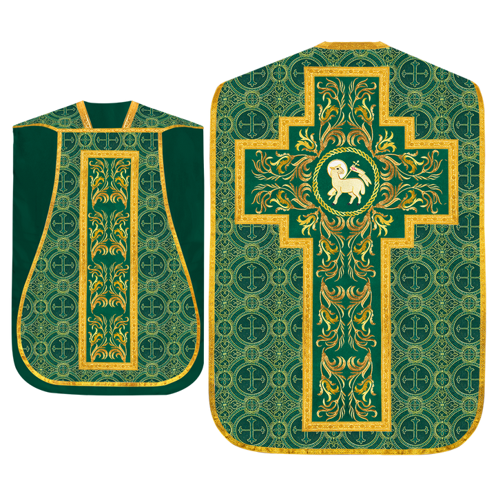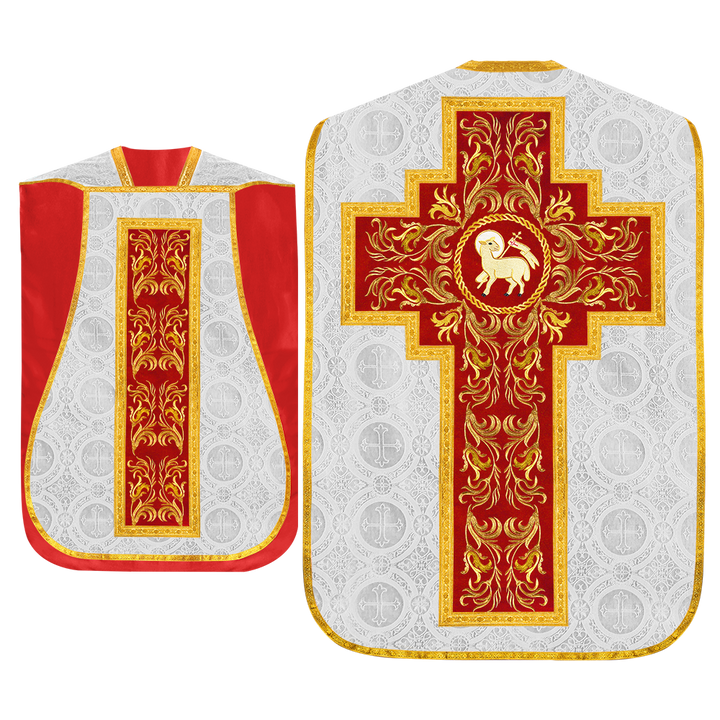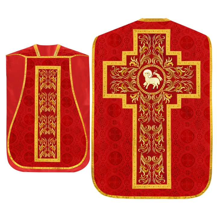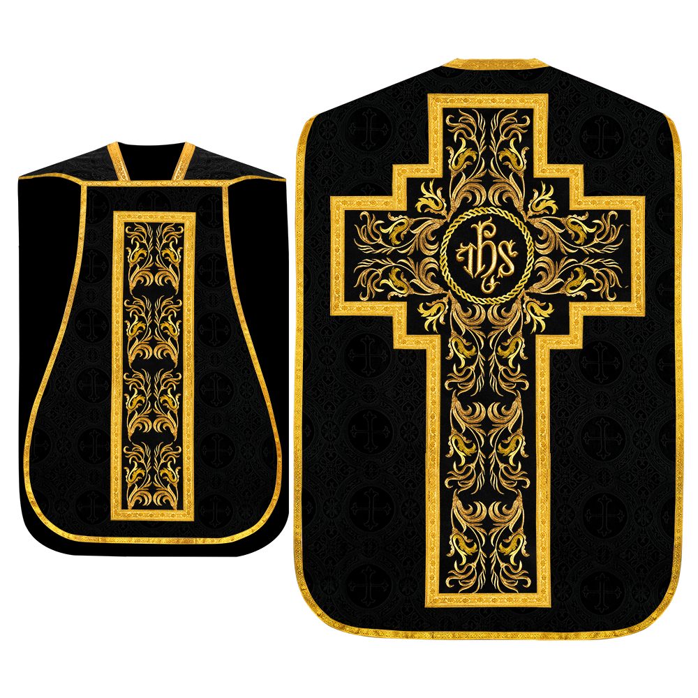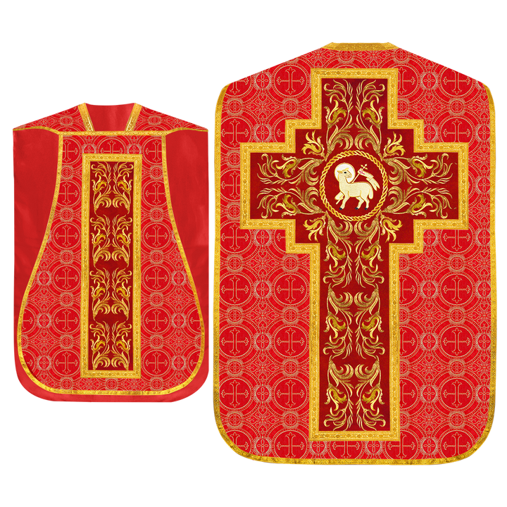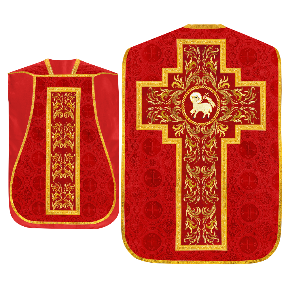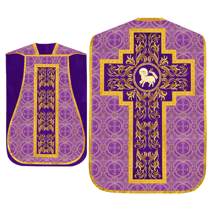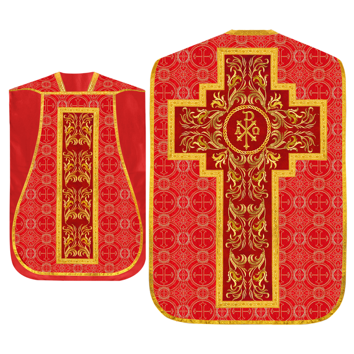 This set comprises beautiful fiddleback with matching stole The Fiddleback is made of Damask Fabric. It has satin fabric lining. The attractive Orphrey is made of matching silk fabric. The Orphrey is embroidered with rich golden yarns. The ends of the whole vestment are finished with golden braids. Mass set is optional with extra charges.