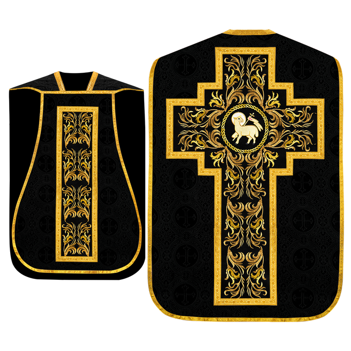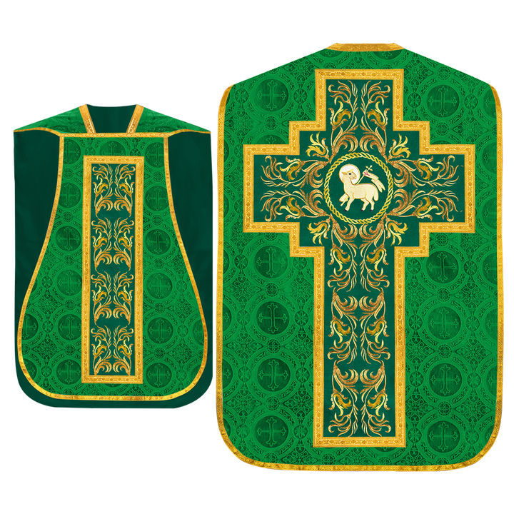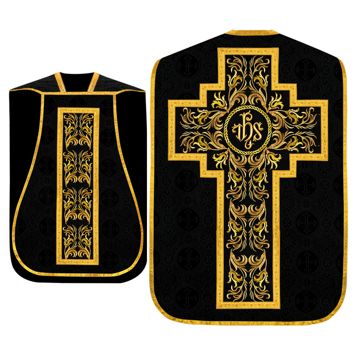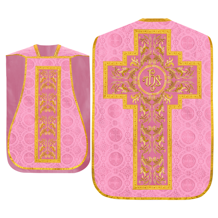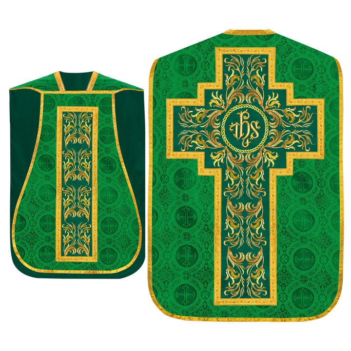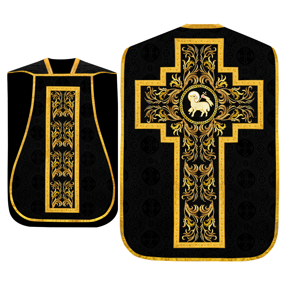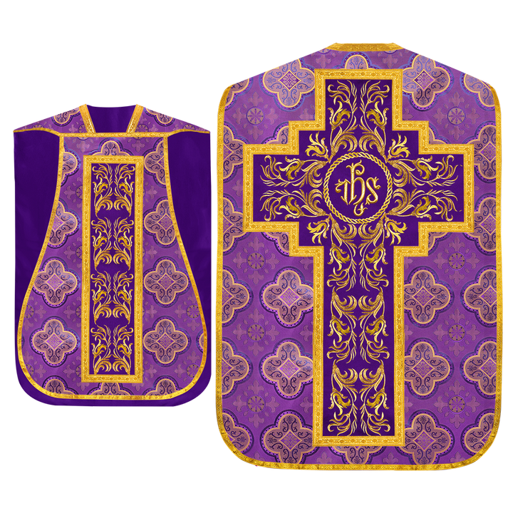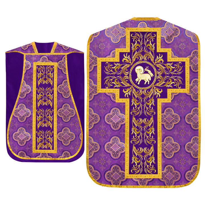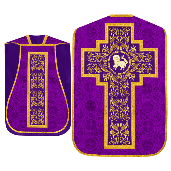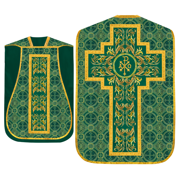 This set comprises beautiful fiddleback with matching stole The Fiddleback is made of Damask Fabric. It has satin fabric lining. The attractive Orphrey is made of matching silk fabric. The Orphrey is embroidered with rich golden yarns. The ends of the whole vestment are finished with golden braids. Mass set is optional with extra charges.