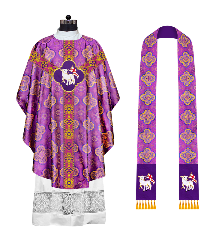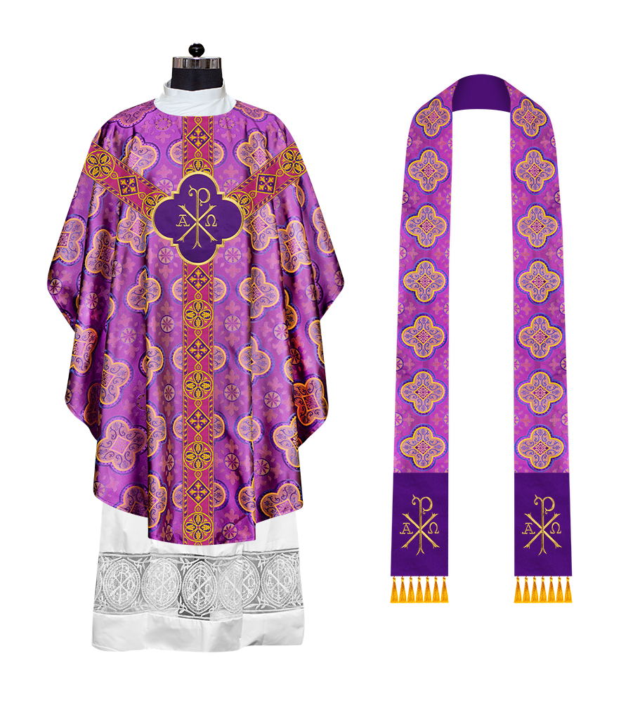 Features: ● The Y-type orphrey of the Gothic Chasuble is made of rich woven braids. ● The orphrey is adorned with spiritual motif from any of the following motif options * IHS * PAX * Agnus Dei * Chalice ● A matching stole is included in the set (50'' Long, 5.5'' Wide) Optional: ● The collar type of the chasuble can be made from any of the following collar options with no additional charges * Cowl * Pullover * Standup * Zipper