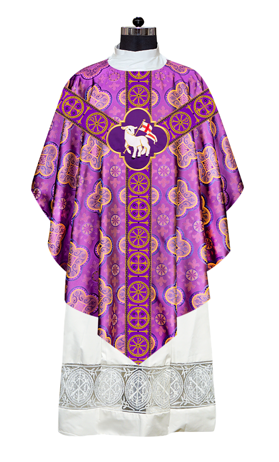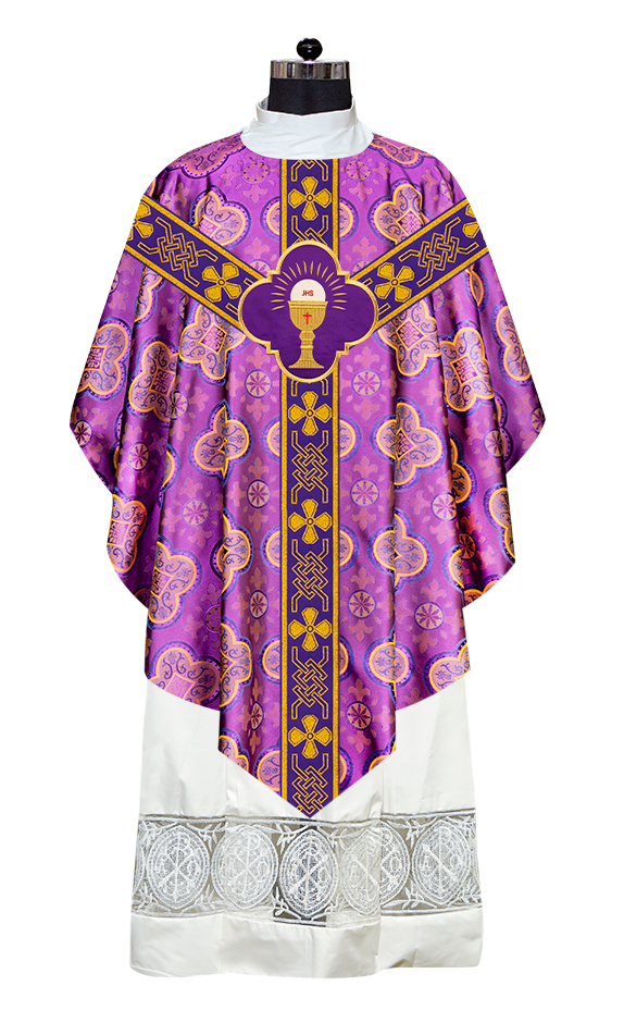 Optional:● The collar type of the chasuble can be made from any of the following collar options with no additional charges * Cowl * Pullover * Standup * Zipper● The Chasuble is made with no lining but it can be made lined for extra charges only.● Matching mass set is optional for extra charges only and it comprises: Chalice Veil (20'' X 20") Maniple (19'') Burse (10'' X 9'') Chalice Pal (8" X 8")